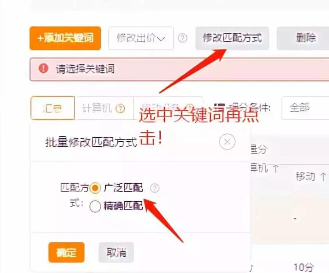 这里注意,如果关键词点击率比较低就开精准,点击率高就开广泛!